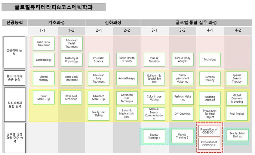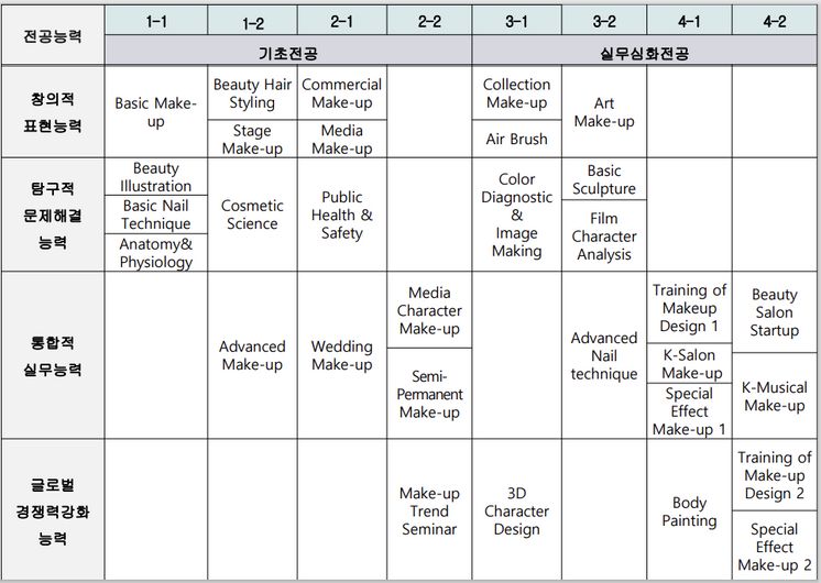 - 다양한 문화에 대한 개방적 소통을 통해 글로벌에서도 경쟁력을 갖출 수 있는 메이크업디자인 콘텐츠를 개발할 수 있는 능력